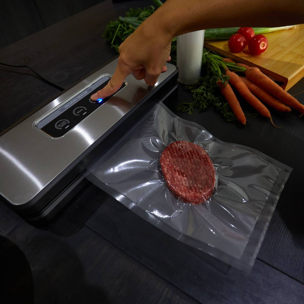 Machine sous vide alimentaire inox brossé SPRINGS 150W pour conservation des aliments + Inclus 10 sacs sous vide :20x25cm. Idéal pour la viande, poissons, le fromage, les légumes, les fruits, les herbes et les aliments marinés, etc. La machine sous vide KITCHEN MOVE garde vos aliments jusqu'à 8 fois plus longtemps ; frais sans conservateurs